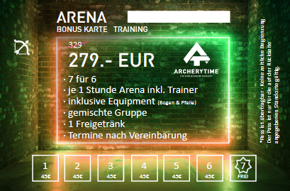 *Bei Benutzung von eigener Ausrüstung müssen die Pfeile vor Benutzung der Arena gründlich gereinigt werden und dürfen keine rostigen oder beschädigten Spitzen haben!